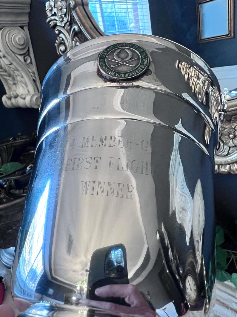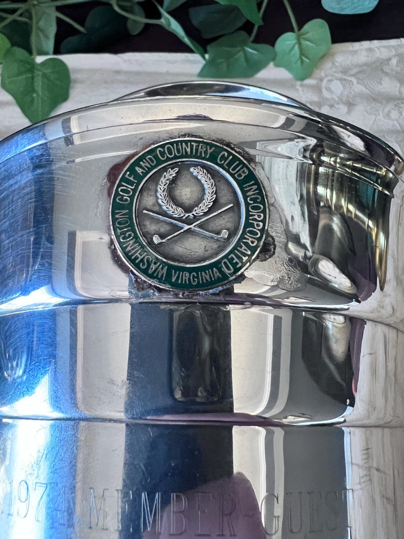 Vintage Leonard Silverplate Small Champagne Ice bucket. Award item with "1974 Member Guest First Flight Winner" etched and medallion attached.